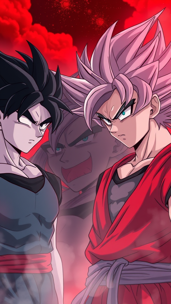 Dragon ball-inspired art featuring charming anime characters, infused with a solarization effect, predominantly in dark red and gray hues. The scene is ultra-high definition, highlighting handsome figures in dark silver and sky-blue tones. The image includes heavy shading, creating a dynamic atmosphere with bold contrasts, all within an aspect ratio of 63:128 and a stylized approach at level 750, version 6, with creative adjustments that enhance the core visual concept.