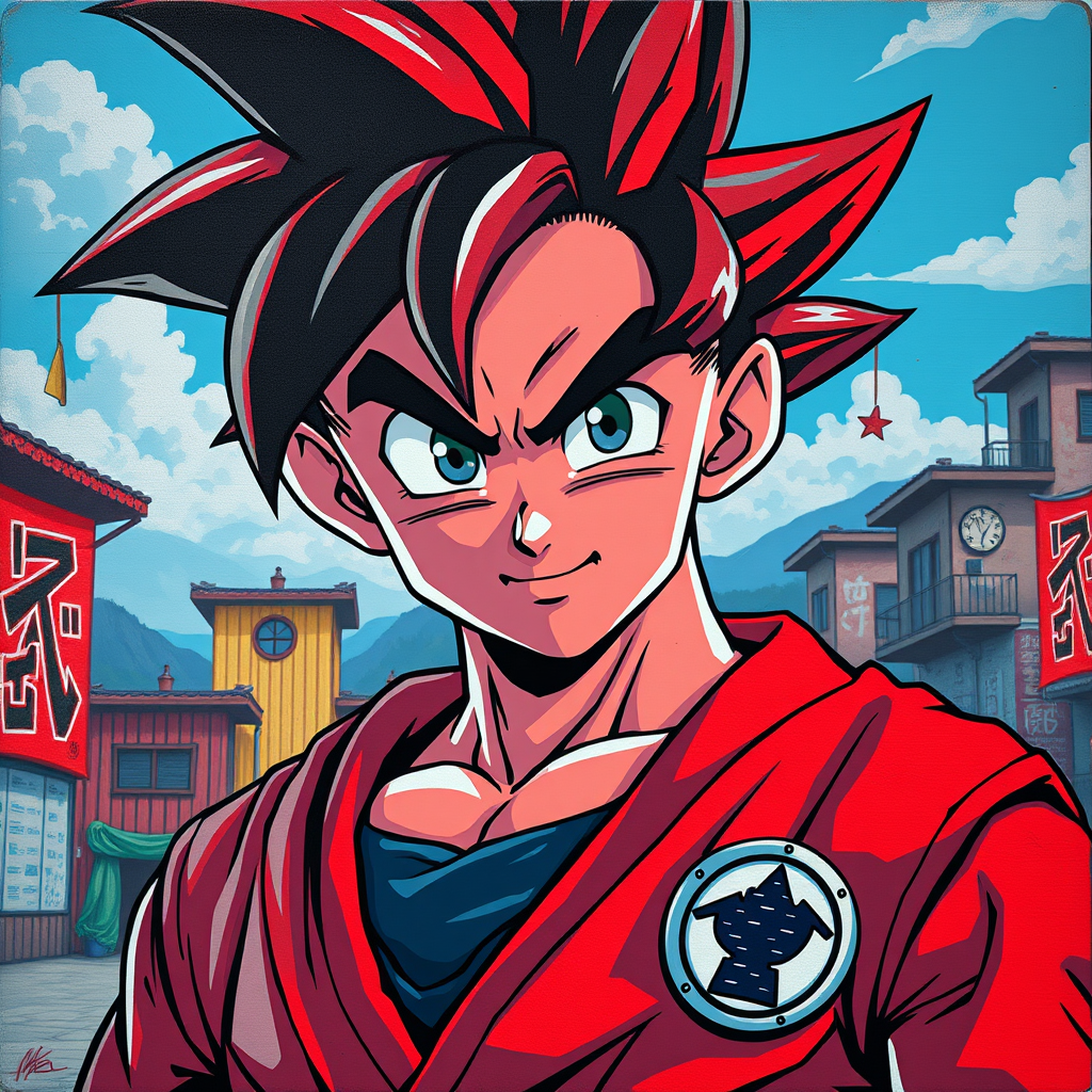 dragon ball-inspired portrait of dr goku in a street art aesthetic featuring cute cartoonish designs infused with photo-realistic techniques, embracing a dark red color palette reminiscent of childhood arcadias, blending anime aesthetics with cartoon-like figures in an imaginative and visually vibrant style