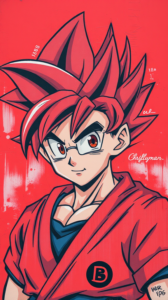 Dragon Ball inspired portrait of Dr. Goku in street art style, featuring cute cartoonish designs blended with photo-realistic techniques, dark red tones, reminiscent of childhood arcade themes, anime aesthetic with cartoon-like figures, capturing the essence of imagination and adventure.