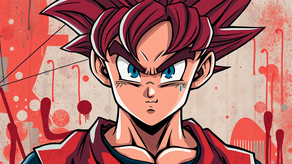 dragon ball inspired portrait of dr goku in the style of street art aesthetic featuring cute cartoonish designs with photo-realistic techniques in dark red tones capturing the essence of childhood arcadias, blends anime aesthetic with cartoon-like figures, adding whimsical elements in deep blue highlights, integrating urban graffiti patterns for a dynamic and playful vibe