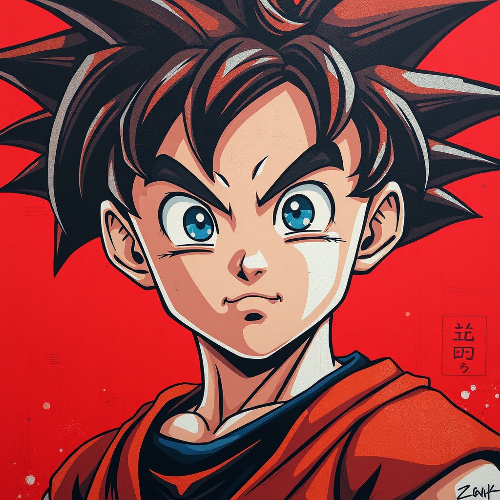 Dragon Ball inspired portrait of Goku, merging street art aesthetics with cute cartoonish designs, showcasing photo-realistic techniques. The composition features dark red hues and elements reminiscent of childhood arcadias, blending anime aesthetics with cartoon-like figures, capturing the essence of youthful adventure and vibrant imagination.