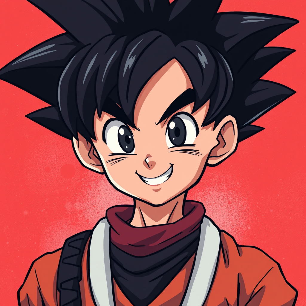Dragon Ball portrait of Dr. Goku in the style of street art aesthetic, featuring cute cartoonish designs and photo-realistic techniques, with a dark red color palette, evoking childhood arcadias. The artwork blends anime aesthetics with cartoon-like figures, capturing the playful yet powerful essence of Goku in a nostalgic, imaginative world.
