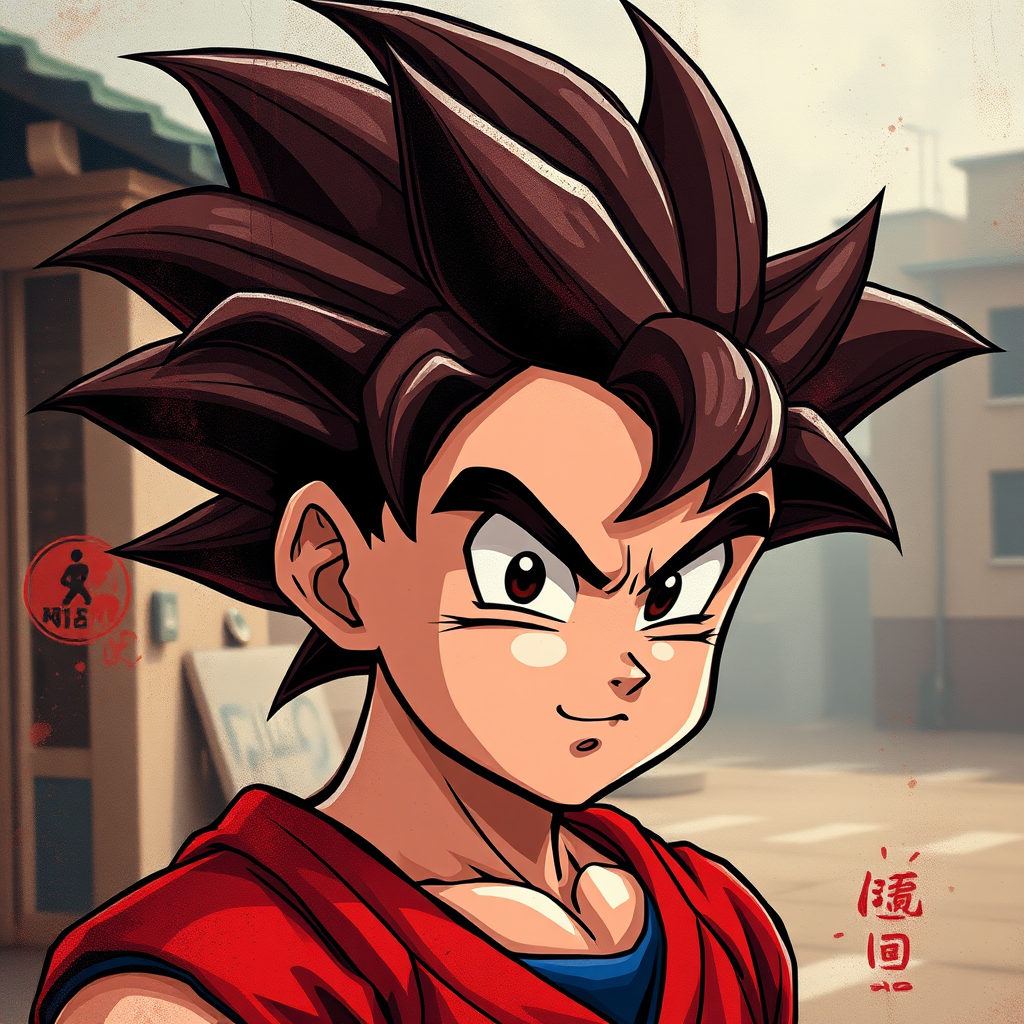 Dragon Ball portrait of Goku, blending street art aesthetic with cute cartoonish designs and photo-realistic techniques, featuring dark red tones. Capture the essence of childhood arcadias with an anime aesthetic, incorporating cartoon-like figures.