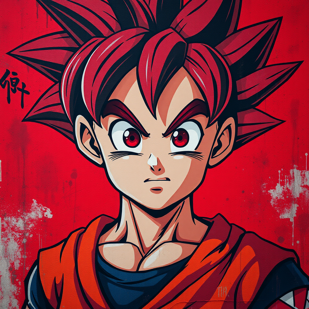 Dragon ball portrait of Goku in a street art aesthetic featuring cute cartoonish designs blended with photorealistic techniques, highlighting dark red hues, capturing the essence of childhood arcadias with anime aesthetic and cartoon-like figures, adding a touch of whimsical imagination and charm.