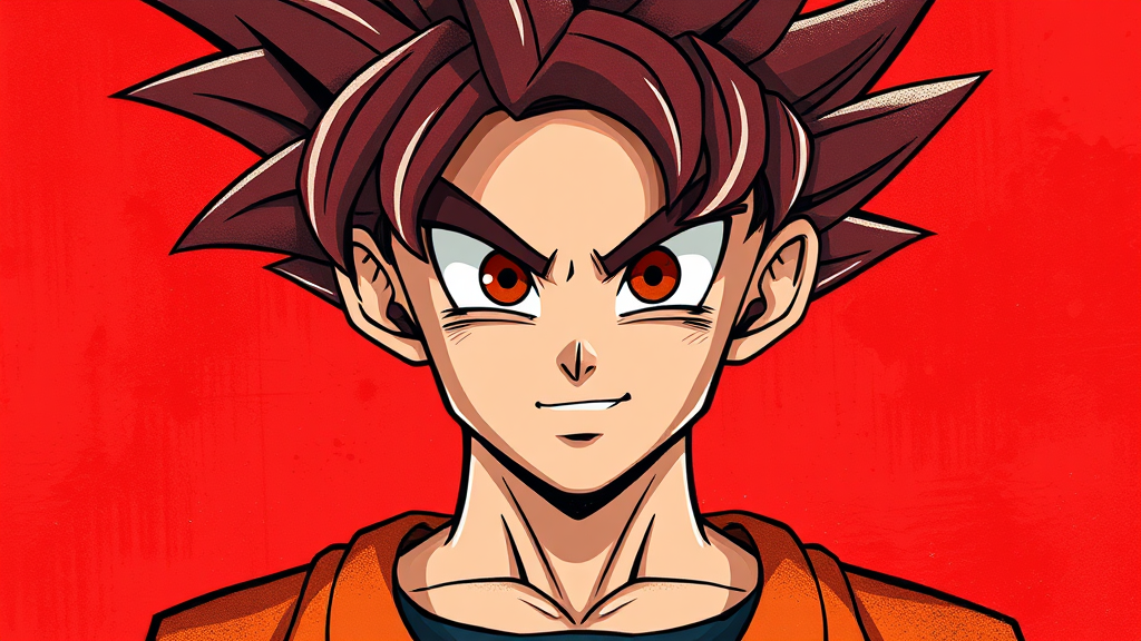 dragon ball portrait of goku in a street art aesthetic blending cute cartoonish designs with photo-realistic techniques featuring dark red tones capturing the essence of childhood arcadias infused with an anime aesthetic and cartoon-like figures rendered in a tall aspect ratio with a whimsical yet sophisticated style