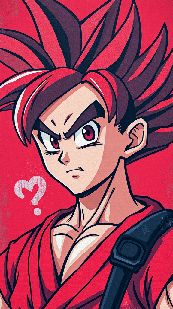 dragon ball portrait of goku in a street art aesthetic blending cute cartoonish designs with photo-realistic techniques featuring a dark red color palette evoking childhood arcadias infused with anime aesthetics showcasing cartoon-like figures with elements of urban graffiti style and a touch of whimsy