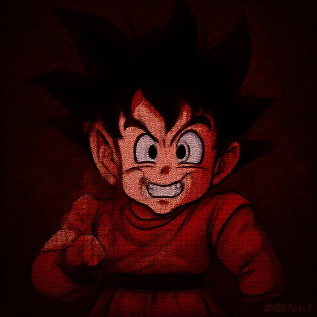 Dragon Ball portrait of Goku in a street art aesthetic, featuring cute cartoonish designs with photo-realistic techniques, infused with dark red tones and childhood arcadias, combining anime aesthetic with cartoon-like figures, presents Goku in a vibrant, youthful depiction with stylized graffiti elements and playful expressions, encapsulating the nostalgic essence of arcade-era adventures.