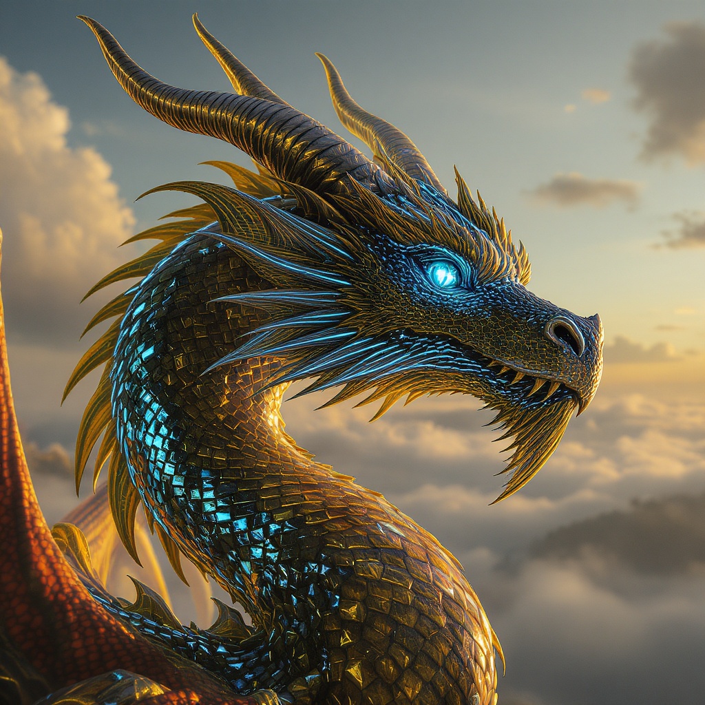 A majestic dragon gazes across the horizon, its eyes a dazzling display of intelligence, shimmering in shades of blue and gold. Its vibrant, gold-lined scales glisten under the sun, interwoven with delicate flecks of silver that catch the light. Small, elegant frills adorn its head and chin, adding an air of regal elegance. The scene is enveloped in volumetric lighting, highlighting the intricate details of the dragon’s form. Each scale is meticulously rendered, and its claws are sharp with meticulous detail. The hyper-realistic portrayal captures the vivid textures and colors, emphasized by ultra-detailed HDR and 8K resolution. The lighting accentuates every contour and shadow, bringing the creature to life with photorealistic depth and sharp focus. Despite its mythical appearance, the dragon holds a unique beauty, with its ultra-realistic details and intricate features creating a portrait of elegance and power.