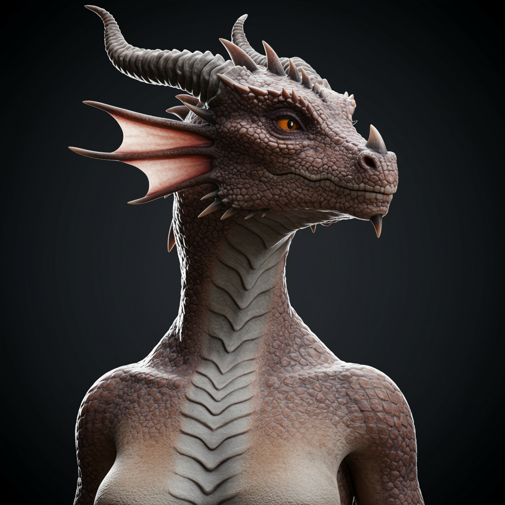 Dragon, graceful female, slender, intricately detailed, rendered in 3D with stunning clarity, 4k resolution, hyper-realistic using Maya and ZBrush techniques, lifelike and photo-realistic animation, close-up portrait, head shot with no background, evocative of a cinematic movie still, capturing the essence of a fantasy scene, --ar 9:16