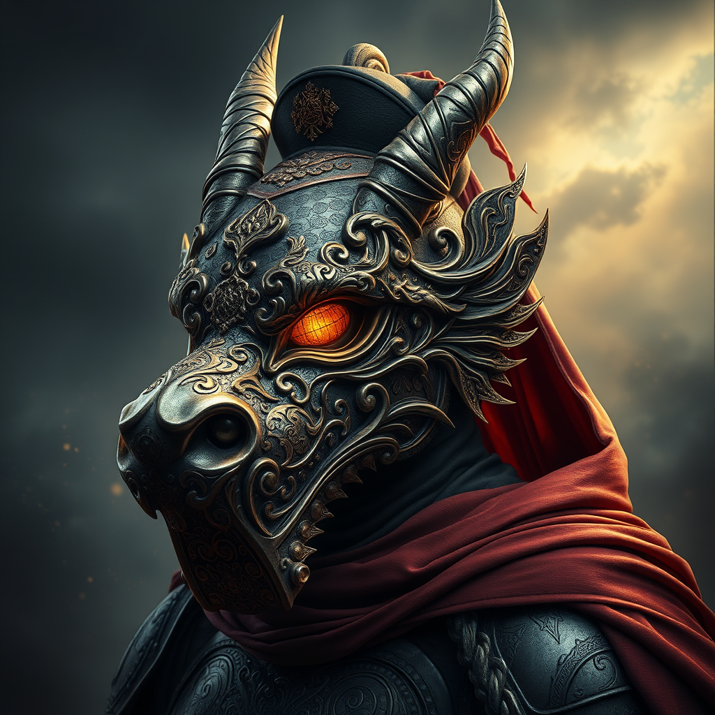 Dragon mask armor portrait with intricate filigree and scrollwork, set against a backdrop of atmospheric perspective and moody light, in the manner of a stylized Sfumato-inspired masterwork, adorned with kepi and cape, as envisioned by a fusion of a fine art realist like Filip Bodnarchuk and a fantastical visionary like Behzinga