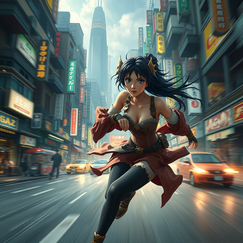 Dramatic chase scene with an action-packed, cinematic vibe featuring a stunning rogue princess navigating through a vibrant, bustling cityscape with motion blur effects, capturing the ethereal beauty and intricate detail reminiscent of Miyazaki's artistry, rendered in a photorealistic and hyperrealistic style.