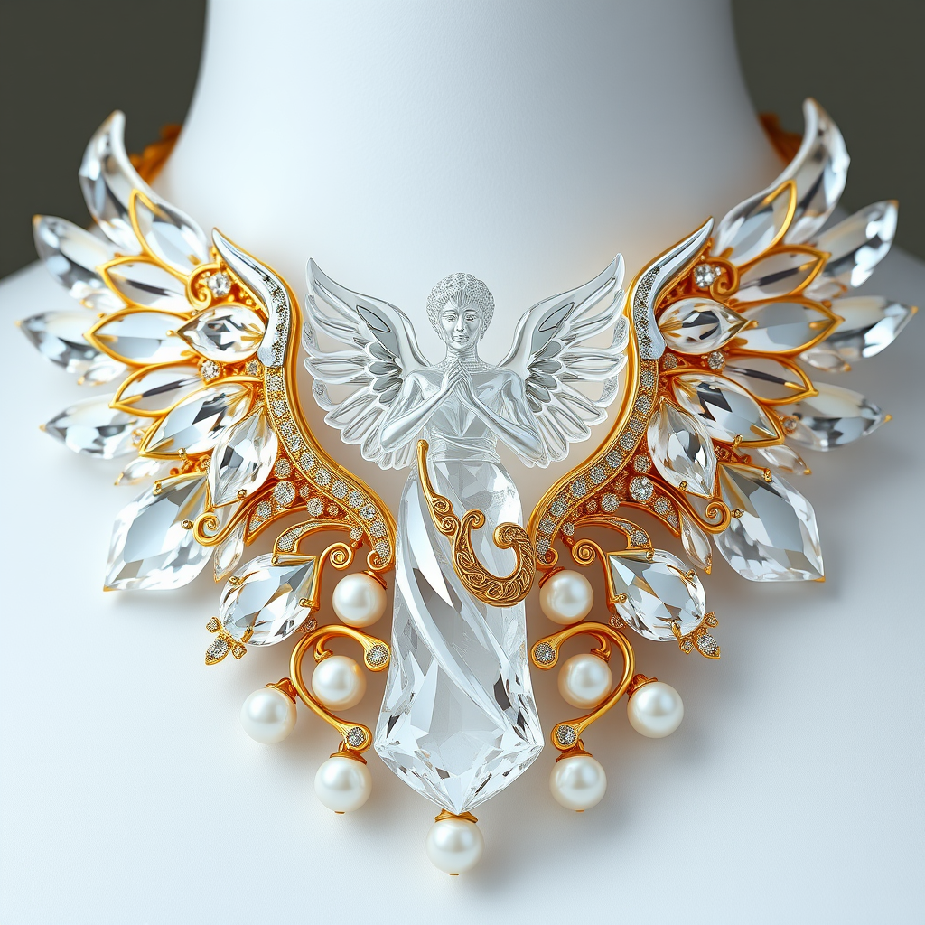 Dramatic gold and white gold elegant necklace featuring crystal quartz and pearls, with a human-angel-inspired collar design. Large, faceted ice crystal angel wings wrap around the collar, showcasing intricate golden inlay. The focal point is a hyper-realistic ice crystal angel figure standing in the center, exquisitely designed with meticulous detail. Captured in ultra-realistic, clean object photography, illuminated for a stunning effect, with a close-up product view, rendered in octane, 32K resolution, with no background, and an aspect ratio of 9:16.