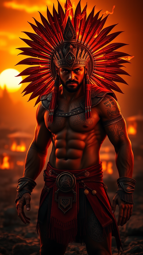 Dramatic lighting, hyper-realistic, hyper-detailed, highly detailed, head, face, torso, arms, hands, legs, feet, full body, fierce and savage-looking male, dark theme and aesthetics, finely detailed, muscular and brutal, set against a backdrop of a burning city while the sun is setting, warm colors with tones that complement orange, red, and turquoise from an ancient era. He is wearing epic attire, featuring vibrant, sunset-complementary colors and is adorned with a majestic headdress that is aflame, crafted from intricate and massive elements. The headdress serves as the main focal point, adding to the extremely vibrant color palette. The scene depicts a 35-year-old man, themed around ancient intensity and power.
