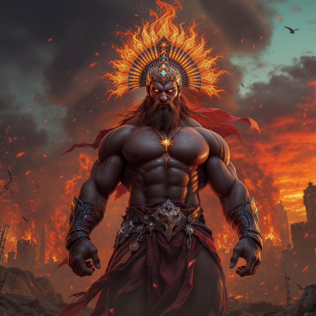 A hyper-realistic, dramatic scene featuring a finely detailed, muscular, and savage-looking 35-year-old male. He stands with a powerful presence, his full body including head, face, torso, arms, hands, legs, and feet highly detailed and illuminated by the vibrant ambiance. Set against the backdrop of a burning city at sunset, the sky awash with warm colors that complement oranges, reds, and turquoise. The atmosphere is dark and ancient, with a theme that underscores an era long past. The main focus is on his majestic headdress, which is ablaze with fire, designed from intricate elements that suggest strength and power. The vibrant hues and dynamic lighting capture the fiery spirit of the scene, with colors harmonizing beautifully with the energizing tones of a sunset. The character’s attire and the scene’s aesthetic evoke grandeur amidst the chaos, with creative touches that heighten the dramatic essence.
