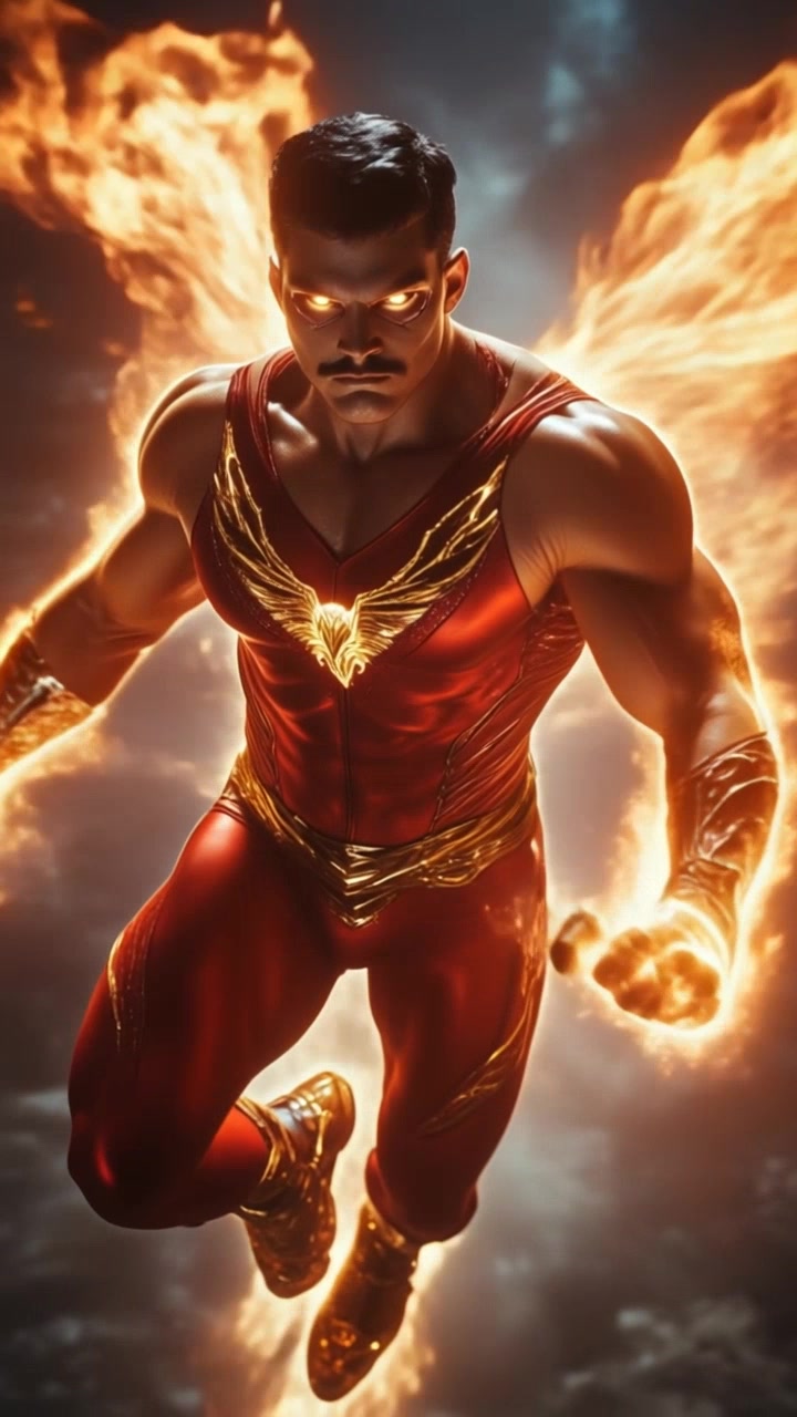 Dramatic superhero portrait, photorealistic male fashion model, dynamic action pose in mid-flight, cinematic lighting, volumetric fire effects. Athletic French Caucasian man, 6'2", lithe muscular physique like a gymnast. Chiseled facial features, high cheekbones, strong angular jawline, pronounced brow. Striking pale ice-blue eyes beneath ruby-red solar shield visor with metallic finish. Styled noir-black hair, undercut fade sides, longer textured top swept back dramatically. Precise black chevron mustache, clean-shaven face, flawless complexion. Wearing form-fitting spandex costume: crimson red compression shirt with deep v-neck to navel, strategic side cutouts revealing obliques, sleeveless to showcase defined arms. Metallic gold geometric hawk emblem emblazoned across pectorals, high-detail rendering. Armored red gauntlets with raised gold flame patterns, energy emanating from palms. Metallic crimson utility belt with angular v-design, tech details. Marigold gold compression tights with arterial flame patterns ascending from knees, high-gloss finish. Crimson metallic boots to knees, gold flame accents, armored appearance. Massive fiery hawk-shaped aura surrounds figure, particle effects, heat distortion. Dual flame streams spiraling from hands, volumetric lighting. Hero shot composition, low angle view, dramatic backlighting, lens flares, smoke effects. Style: hyper-detailed digital art, 8k resolution, octane render, dynamic motion blur, rim lighting, atmospheric perspective.