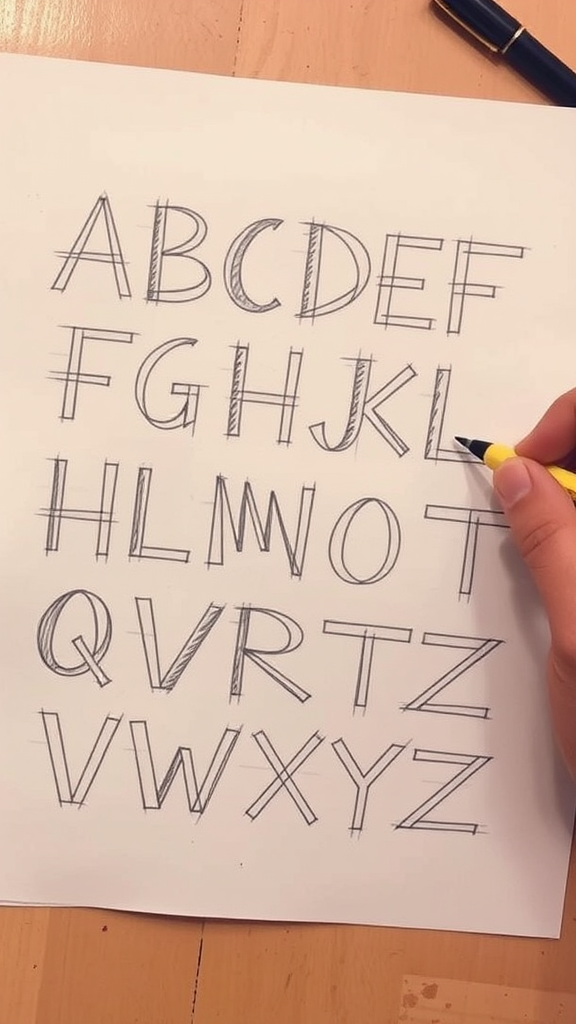 Draw a stylized alphabet on paper, sketching each letter with unique and artistic flair, ensuring the design remains cohesive and visually captivating.