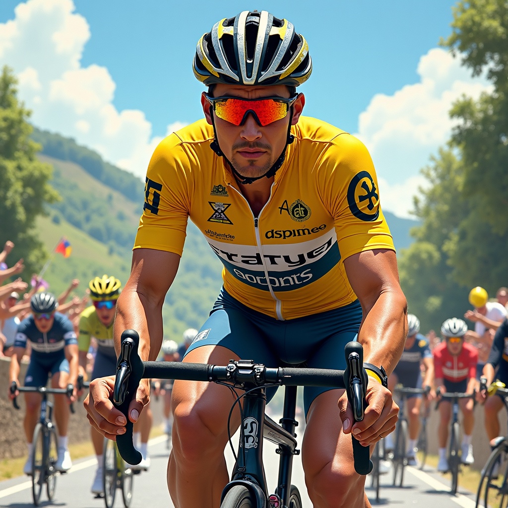 A breathtaking and highly-detailed drawing captures the essence of a Sports Illustrated cover photo featuring the Tour de France. The central focus is a cyclist in the iconic Yellow Jersey, displaying intense concentration and determination. The scene is set against a stunning backdrop of the French countryside, with rolling hills and cheering spectators. The artwork showcases the cyclist's muscles straining and a glint of sweat under the bright sun, embodying the spirit of intense athletic competition. The photorealistic style brings every element to life, from the intricate details of the bicycle to the dynamic movement of the cyclist. While keeping true to the core concept, subtle creative modifications include a slight tilt in the perspective to emphasize speed and motion.
