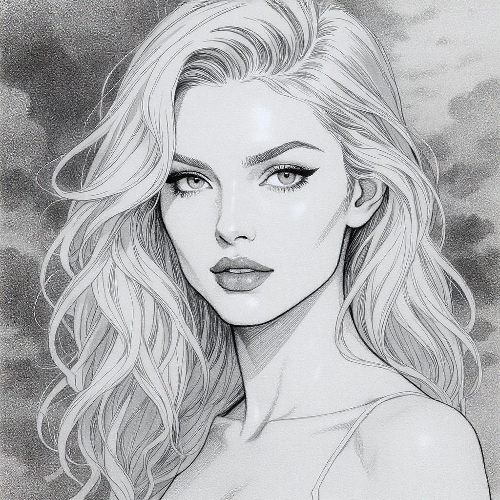 Drawing of a woman in the style reminiscent of Kieron Gillen and Augustus John, utilizing a light gray palette with intense close-ups. The piece exudes a breathtaking beauty, incorporating bold use of line akin to Clayton Crain's technique, capturing the viewer's attention with its striking composition and masterful stylization.