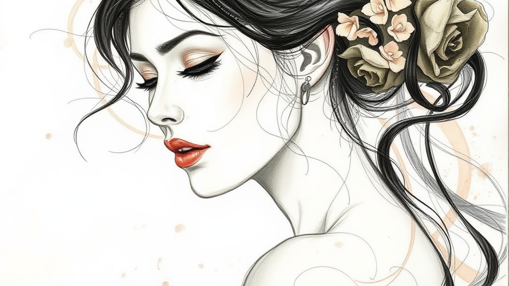 Drawing of an elegant woman, influenced by nature-infused art nouveau, reminiscent of video montages, with a soft-focused beauty that's truly captivating; minimalist sketches highlight her graceful curves, complemented by expressive, free-flowing brushwork.