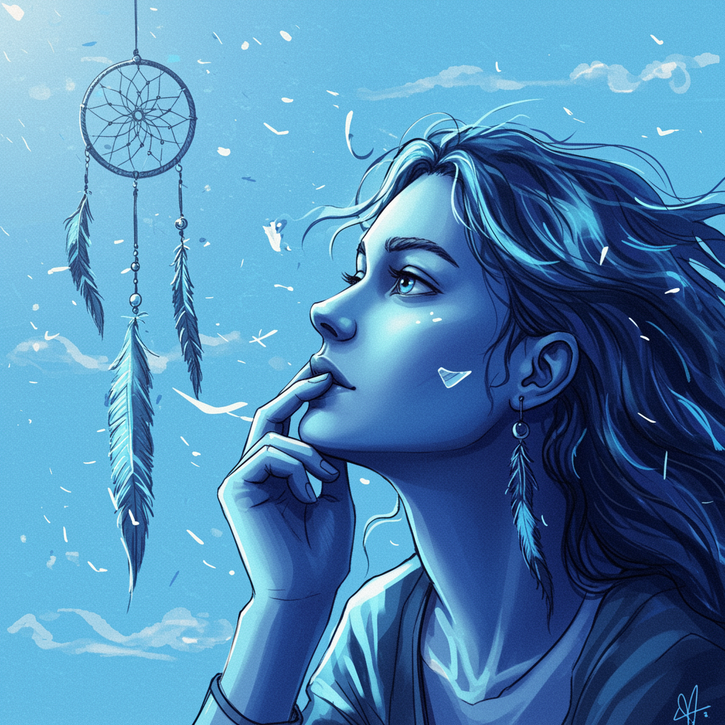 Dream Catcher, crafted in vivid neo-pop illustration style with a serene sky-blue palette, infused with nightcore energy and masterful trompe-l'œil detail, showcasing intricate penciling. The piece portrays a thoughtful portrait, where elements of animation seem to flutter like an animated gif, creating a dynamic tension against the calm backdrop. Ratio: 35:64, with high stylization bringing a modern, kinetic twist to a timeless allure.