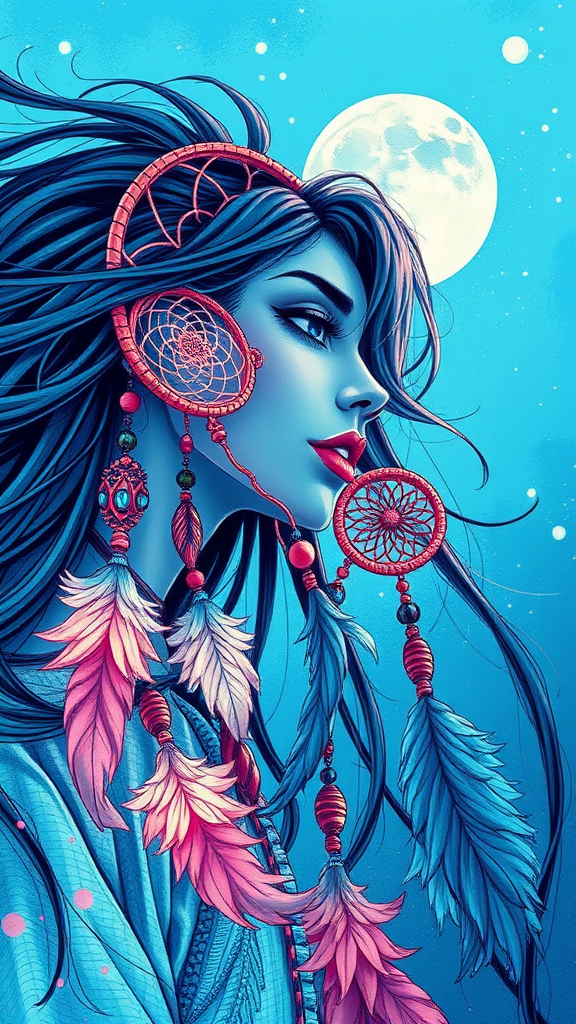 Dream Catcher, vibrant neo-pop illustration, sky-blue tones, nightcore energy, trompe-l'œil details, intricate penciling, thoughtful portraiture, dynamic motion elements, 35:64 aspect ratio, high stylization