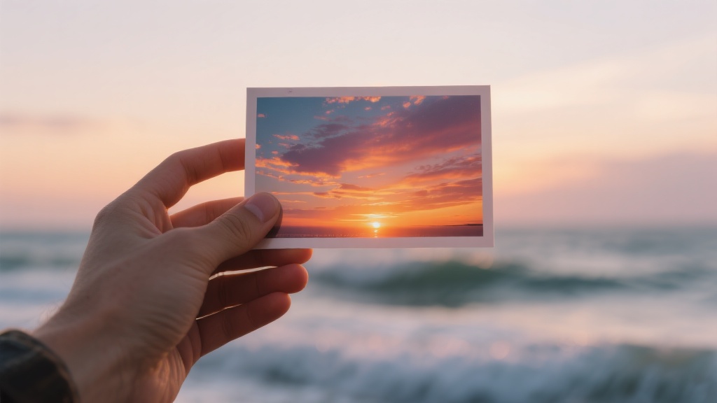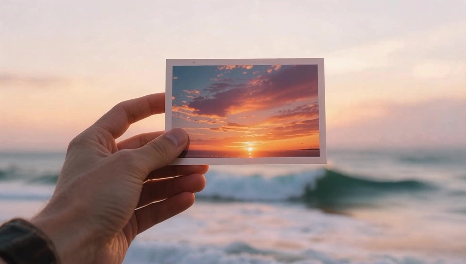 View this AI-generated image featuring dream like scene of a printed photograph hovering above a wooden table soft golden light flooding through a nearby window the picture surface rippling into moving water while the room background remains blurred warm vintage colour palette no text or ui elements