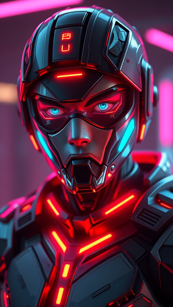 Dreamlike 3D render of a futuristic military android featuring cyberpunk aesthetics, resembling a sleek warframe with stealth capabilities; adorned in armor illuminated by vibrant neon lights. The character design showcases a balance of hard surface and smooth textures, with an intricately detailed symmetrical face. Enveloped in volumetric and ambient lighting, the scene captures real-time VFX elements. Rendered in ultra-high-definition HDR, meticulously avoiding elements like deformed anatomy, and ensuring harmonious proportions. Framed to highlight realistic details, avoiding cartoonish or exaggerated features, achieving a digital painting aura.