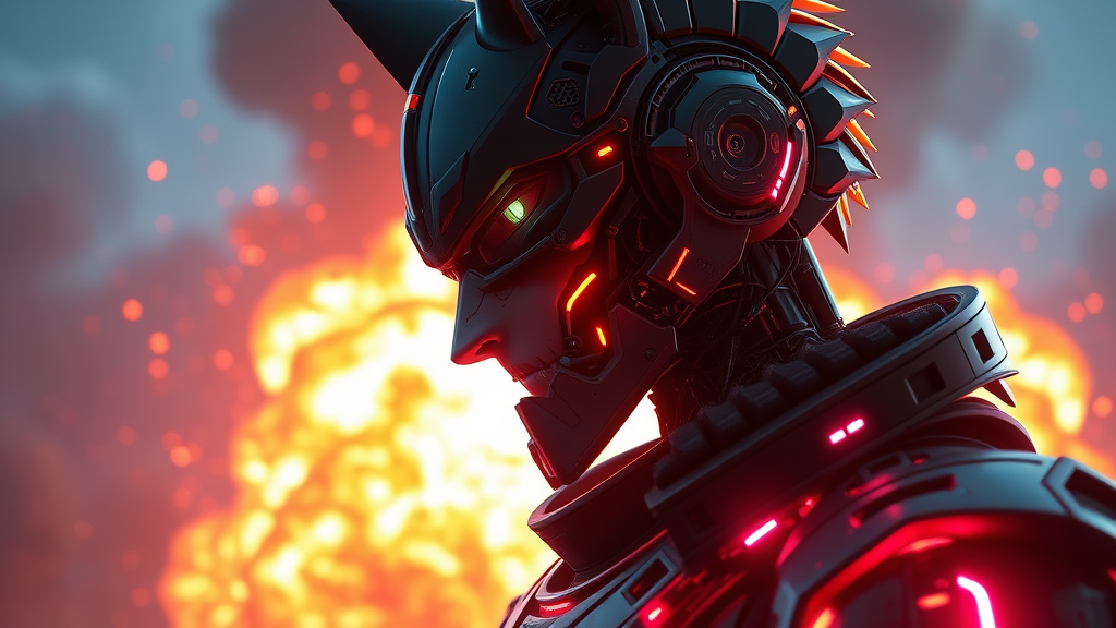 Dreamlike art, 3D render of a futuristic military cyborg, cyberpunk-themed with a wolf motif, warframe-inspired stealth armor, illuminated by vibrant neon lights, set against a backdrop of a dramatic explosion. The character design is hard-surfaced yet smooth, with a highly detailed and intricately designed symmetrical face. Volumetric and ambient lighting enhance the real-time visual effects, creating a rich digital 3D experience in UHD and HDR. The side profile emphasizes distinct features like the mouth and ears, with a focus on balanced proportions and anatomy. Avoids elements such as long necks, cropped heads, or cartoonish styles, presenting a powerful and captivating digital painting.