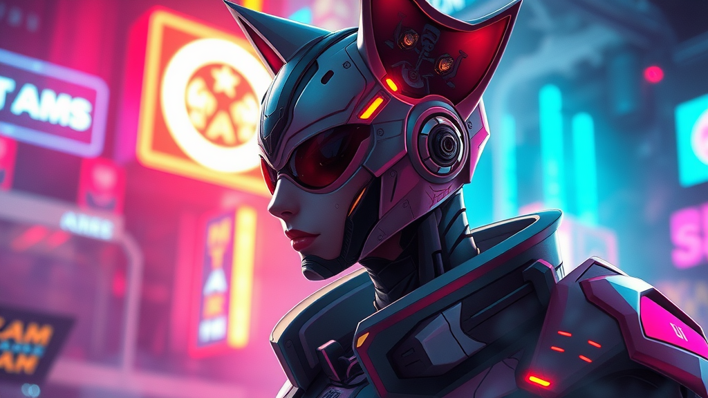 Dreamlike art, digital painting, anime-inspired portrait of a futuristic military cyborg set in a vibrant cyberpunk world, adorned with a sleek warframe and feline agility, embodying stealth and armor beneath glowing neon lights and swirling smoke. Character design emphasizes hard surfaces and smooth contours, with a remarkably detailed face featuring intricate, symmetrical details. Volumetric ambient lighting creates a real-time visual effect, enhanced by VFX elements. The composition captures a side profile, highlighting the mouth and distinctive ears, teasing elements partially out of frame. The visual narrative avoids negative art traits, maintaining proportional anatomy, while ensuring the character exudes an enigmatic allure with an elegantly elongated posture, captured in UHD HDR 3D without compromising on artistic integrity or allure.