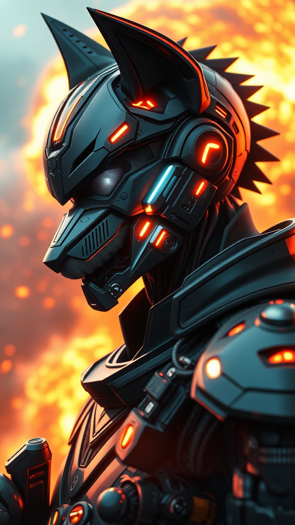Dreamlike art of a 3D render featuring a futuristic military cyborg with a cyberpunk aesthetic, embodying a wolf-like warframe design. The character is stealthy and armored, enhanced by neon lights and set against a backdrop of explosions. Emphasizing character design with hard surfaces and a smooth, intricately detailed face. The composition is highly detailed with symmetrical elements, complemented by volumetric and ambient lighting for a real-time visual effect. The scene is captured in digital 3D, UHD, and HDR for a high-quality presentation. Focus on dynamic side profile, with features such as mouth and ears subtly pronounced, ensuring a balance of realism and cyberpunk style. Avoid elements like blurred or bad proportions, deformed anatomy, or cartoonish influences, instead aiming for polished and realistic artistry.