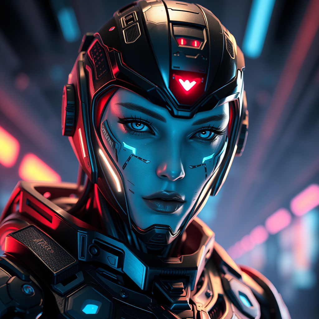 dreamlike art of a 3d rendered futuristic military cyborg in a cyberpunk setting, featuring a warframe-inspired design with stealth and armored elements, highlighted by neon lights. The character design showcases hard surfaces with a smooth, highly detailed face, incorporating intricate symmetrical details. Volumetric and ambient lighting create a dynamic atmosphere, enhanced by real-time VFX. The digital 3D model is presented in UHD with HDR effects, ensuring sharp and realistic imagery. Despite the advanced details, the character avoids negative traits like bad proportions, duplicate features, or deformed anatomy, maintaining an elegant and cohesive appearance without crossing into cartoon or anime styles.