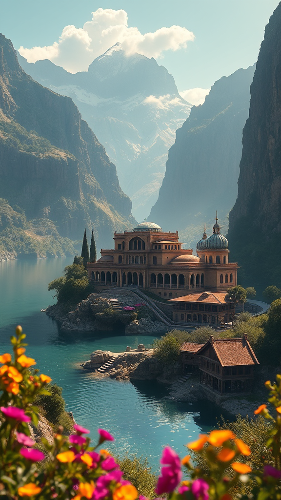 Dreamlike art of an expansive Persian villa nestled amidst shimmering waters and lush nature, set in a quaint village. The scene captures an up-close view with volumetric lighting, achieving a photorealistic quality. The imagery is insanely detailed and intricate, evoking a sense of fantasy and an epic cinematic feel, reminiscent of trending artwork on ArtStation. Towering mountains and massive cliffs frame the scene in a magical, mystical atmosphere, akin to a matte painting on a bright, sunny day. Vibrant flowers adorn the landscape, adding to the dreamlike quality. The piece is crafted in UHD and HDR quality, evoking the sweeping style of Sweeper3D, ensuring every element is captured in breathtaking 16K resolution.