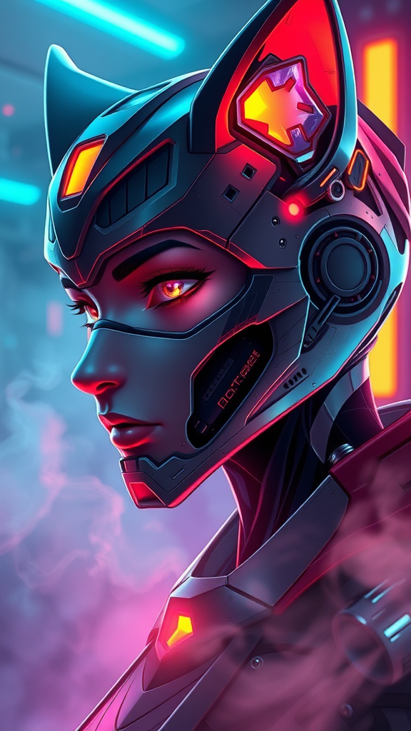 Dreamlike digital art, depicting an anime-style portrait of a futuristic military cyborg with a cyberpunk aesthetic. The character design integrates elements of a warframe and a stealthy armored feline, set against a backdrop of neon lights and smoke. Emphasizing hard surfaces with smooth, intricate details, the piece boasts a highly detailed and symmetrical face. The ambient lighting is volumetric and real-time, enhanced by VFX, creating a UHD HDR 3D effect. The composition features a side profile, focusing on unique facial features such as ears and cybernetic enhancements. While avoiding negative aspects like bad proportions or anatomy, the piece maintains a cohesive and visually striking design.