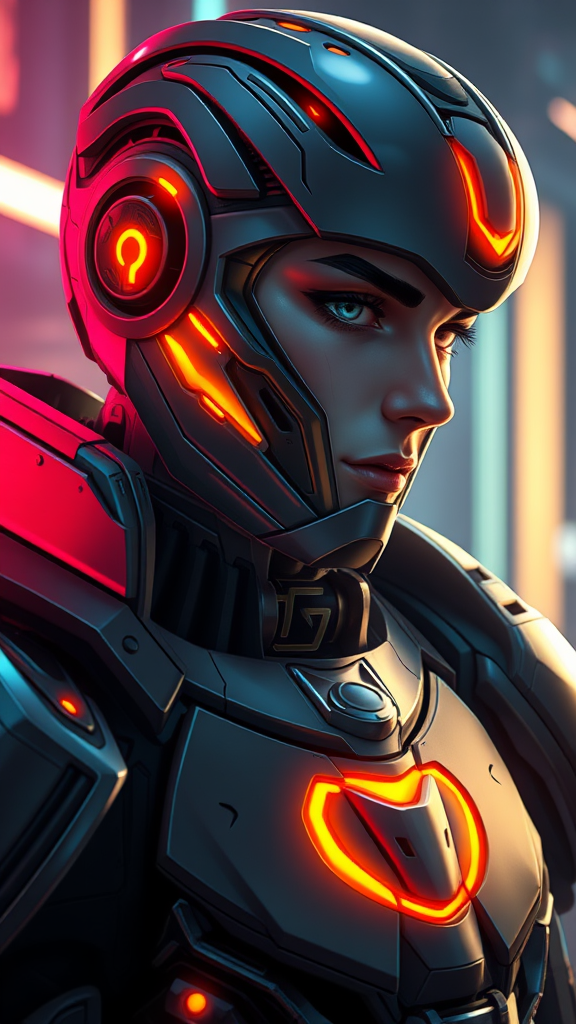 Dreamlike digital painting, anime-inspired portrait of a futuristic military cyborg with cyberpunk aesthetics, showcasing advanced warframe design. Character exudes stealth with intricate, smooth, hard surface armor highlighted by neon lights. Richly detailed face, capturing symmetry and volumetric lighting, set against ambient glow for real-time visual effects. 3D digital artistry in UHD with HDR effects, depicted in stunning side profile. Avoids bad art characteristics such as blurry or gross proportions, ensuring harmonious anatomy and proportionate design. Head and body seamlessly integrated into the scene, maintaining elegance and sophistication.