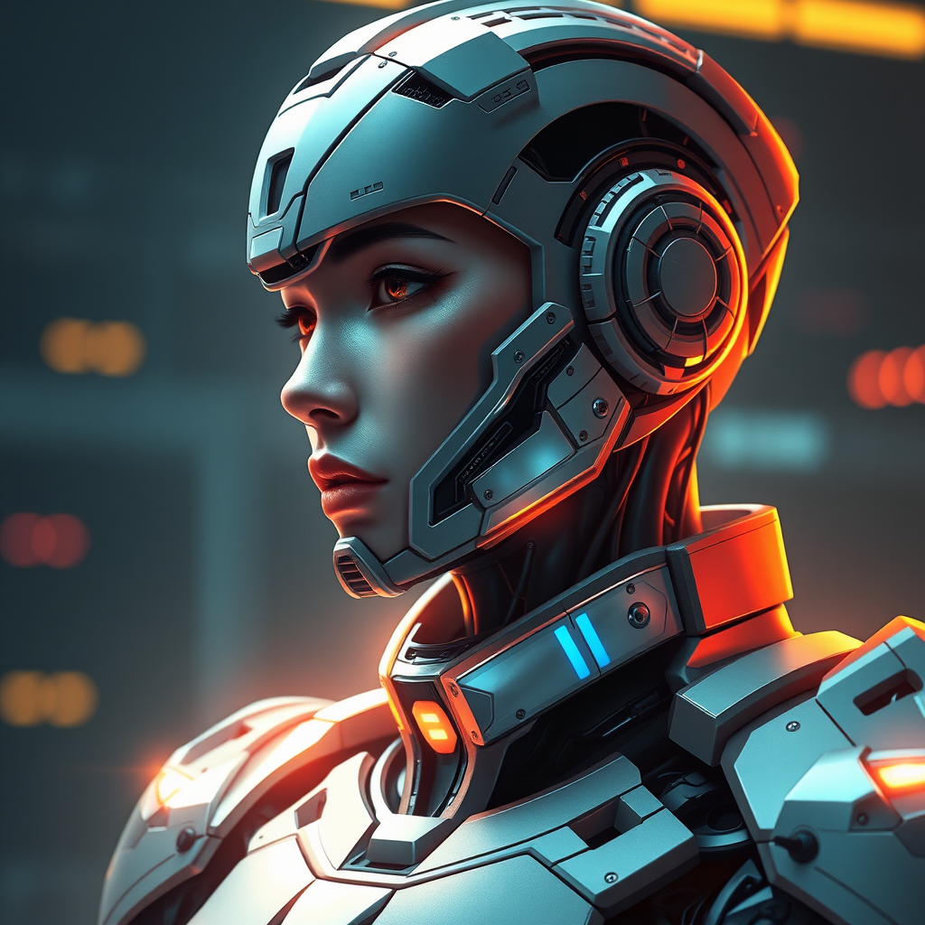 Dreamlike digital painting of a futuristic military cyborg, cyberpunk influence, depicting an armored anime character with stealth capabilities. Neon lights cast volumetric and ambient lighting, highlighting the intricate details and symmetrical design of the hard surface armor. The portrait captures a smooth, detailed face with high attention to detail, rendered in real-time digital 3D with UHD and HDR qualities. The character's side profile showcases advanced character design with a focus on proportion and anatomy, avoiding duplicates, and maintaining an elegant and balanced portrayal.