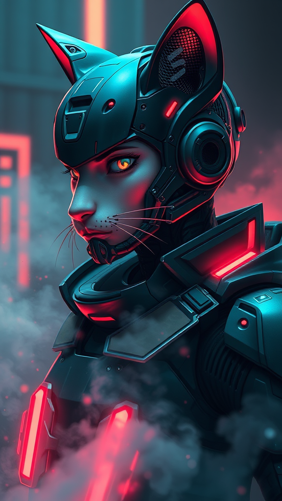 Dreamlike digital painting of an anime-inspired futuristic military cyborg, blending cyberpunk aesthetics with feline characteristics. The character dons stealthy armored attire, illuminated by neon lights amidst swirling smoke. The design features intricate, hard-surface detailing with a focus on a smooth, highly detailed face. Symmetrical and balanced, the composition is enhanced by volumetric and ambient lighting, creating a cinematic real-time VFX atmosphere. The image captures a side profile, emphasizing the unique amalgamation of man and machine, with details like mechanical ears and sleek armor. Avoiding distortions, the anatomy and proportions are carefully crafted, presenting a harmonious blend of artistry and futuristic intrigue.