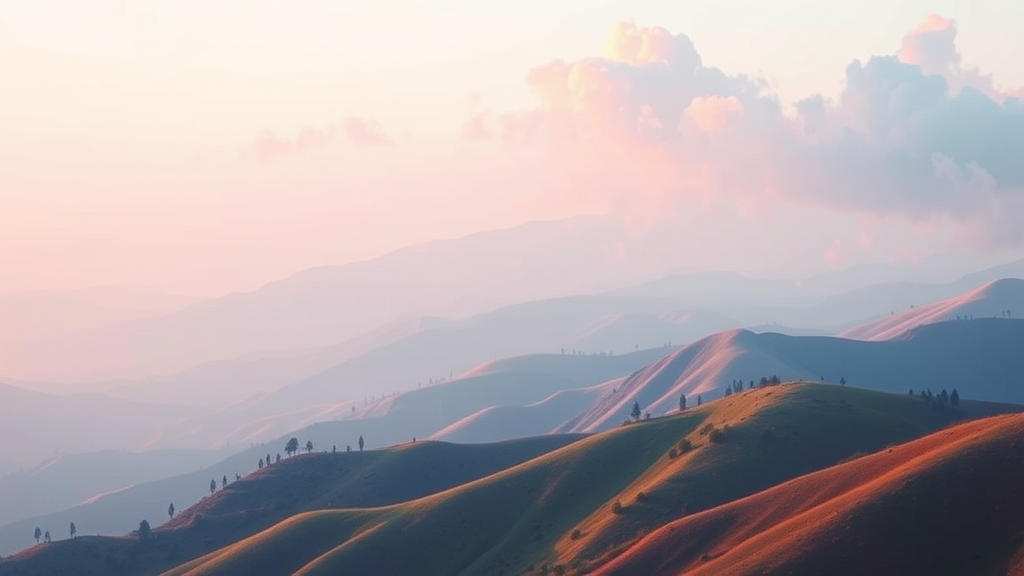 Dreamlike essence with minimalist charm, a landscape stretching vertically, infused with a gentle touch of the surreal, vibrant and soothing hues intermingling, evoking a sense of serenity with a touch of whimsy, subtle distortions inviting curiosity and wonder.
