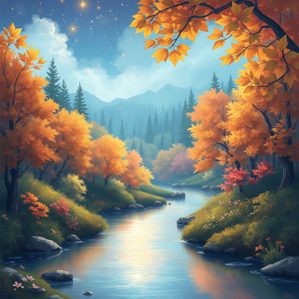 Dreamlike illustration of a serene landscape, where tranquility and calmness float effortlessly across the scene. The background is a vibrant tapestry of lush, colorful woodlands, their leaves a symphony of soft, warm tones. In the foreground, a gentle river meanders gracefully, its waters shimmering like liquid starlight. The scene is imbued with a fairy tale essence, a whimsical world where reality subtly blends with enchantment, drawing you into its peaceful embrace.