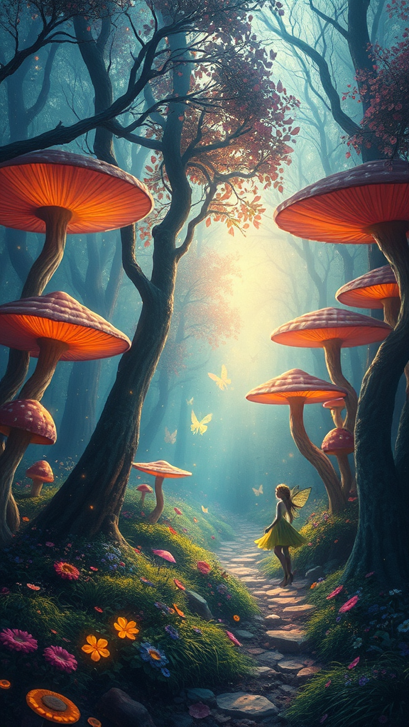 Dreamlike masterpiece painting of an ethereal forest filled with enchanting fairies, illuminated by soft, dream-like light. The scene is bursting with vibrant colors, featuring surreal mushroom trees and casting a delicate, dim glow. The artwork is intricately detailed, evoking a sense of wonder, reminiscent of an Unreal Engine 5 environment. Inspired by the style of Vincent Van Gogh, it captures a sense of timeless beauty in UHD, HDR, and 16K resolution. The composition maintains a high-quality and seamless aesthetic, free of any artifacts or distractions, ensuring an immersive experience.