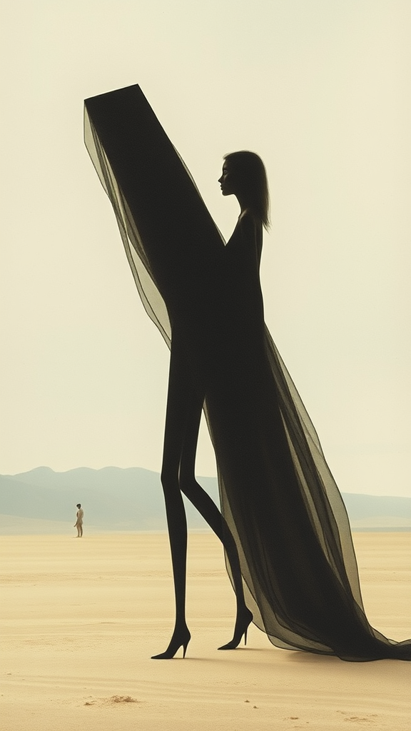 Dreamlike Minimalism portraying elongated figures in a vast, open landscape; subtle distortions and imaginative elements gently intertwine, capturing whimsical essence through muted tones and delicate details.