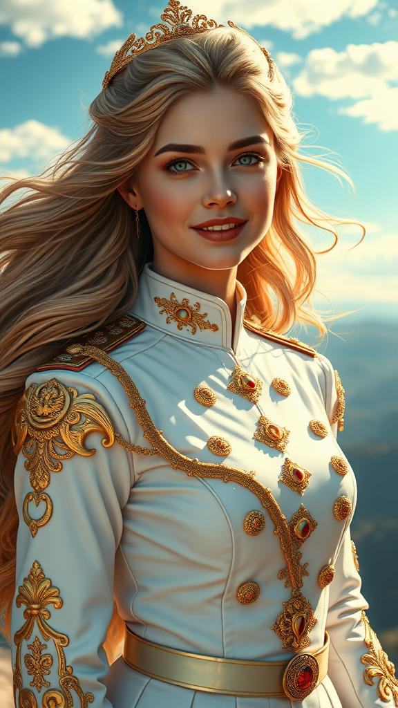 Dreamlike portrait of a stunning humanoid princess with Emilia Clarke's likeness, featuring flowing, lustrous hair. She stands against a breathtaking backdrop, exuding optimism and joy. Her ornate white officer's attire is adorned with exquisite gold embellishments, radiating elegance and intricate detail. The digital painting captures vibrant colors and uses volumetric lighting for a smooth, sharp focus. Inspired by the styles of Artgerm, Greg Rutkowski, and Alphonse Mucha, the piece boasts a 16k UHD resolution with HDR qualities. The scene, reminiscent of concept art, has a cinematic allure with a film grain touch. Created using Fujifilm XT3, the artwork maintains high quality throughout.