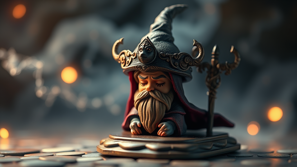 Dreamlike scene featuring a miniature wizard on a base, intricately designed with high detail and sharp focus, showcasing dramatic features and photorealistic elements. The wizard's artful headpiece stands out in a vivid depiction, surrounded by a magical, slightly abstract background. The character's eyes are mysteriously closed, evoking a sense of wisdom and enigma.