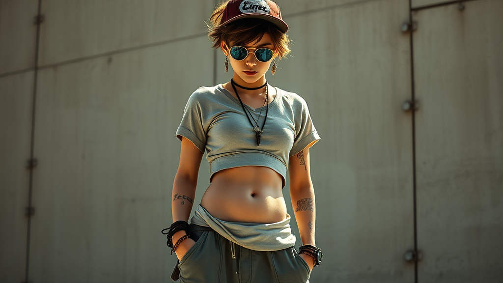 Dreamlike vision of a striking young, slender, fit figure with short, tousled hair, adorned with intricate accessories. Sporting loose-fitting pants and a snug t-shirt revealing a midriff with a bellybutton piercing, this character exudes a sense of dynamic style. Wearing stylish goggles and a trendy cap, they strike an elegant fashion pose. Captured through the lens of a DSLR camera with an F/2.8 aperture, enhanced by lens flare, on a 5D device with 16k super-resolution. The scene is surreal and ethereal, blending fantasy with reality, exuding mystery with highly detailed realism, set against a backdrop of concrete simplicity, both extraordinary and mundane, despite hints of the unaesthetic.
