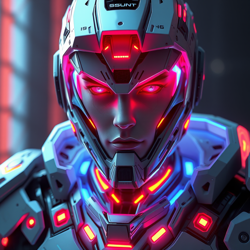dreamlikeart 3d render of a futuristic military android, cyberpunk aesthetic, advanced armor design, stealth-focused, illuminated with vibrant neon accents, intricate character design with hard surfaces and smooth textures, finely detailed facial features, complex symmetrical structures, enhanced volumetric and ambient lighting effects, real-time visual effects, digital 3d representation, ultra-high definition, high dynamic range, careful integration of facial elements, excluding unwanted distortions like elongated necks or cropped heads, avoiding cartoonish or anime styles, aiming for a realistic digital painting approach.