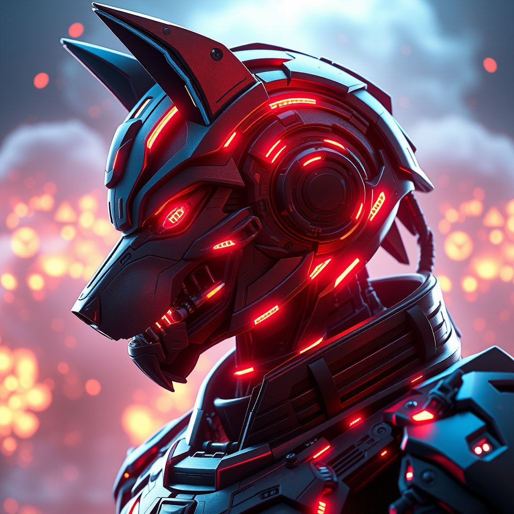 dreamlikeart 3d render of a futuristic military cyborg with a cyberpunk aesthetic, featuring a wolf-inspired design, stealthy warframe armor, highlighted by dynamic neon lights against a backdrop of controlled explosions, emphasizing character design with hard surface details and a smoothly detailed face. The piece showcases highly intricate, symmetrical details enhanced by volumetric and ambient lighting, giving a real-time VFX feel. Rendered in digital 3d with UHD and HDR quality, the side profile captures expressive features like the mouth and ears, highlighting intentional artistic distortions and unique anatomical interpretations. The design avoids traditional perfection, embracing creative and unconventional proportions for a distinct, stylized effect, integrating elements of digital painting with subtle anime influences for an imaginative, otherworldly visual experience.