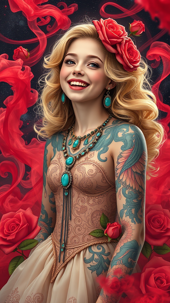 dreamlikeart, a joyful, young blonde girl in a cosmic gown, enchanting and breathtaking, adorned with intricate, rococo and art nouveau-inspired full-body tattoos, highlighted by ornate, turquoise jewelry, surrounded by swirling red smoke and roses, exuding a hypermaximalist, elegant, and vintage aura. The artwork is hyper realistic, exceptionally detailed with soft pastel hues, captured in 16k resolution, UHD, HDR10 for a stunning visual experience. Model: 2DN. Elements to avoid: duplication, disfigurement, mutation, deformation, cloning, cross-eyed features, disproportionate anatomy, additional limbs, low resolution, out-of-frame elements, blurriness, compression artifacts, watermarks, branding, text, cropped or split images, and cartoonish elements.