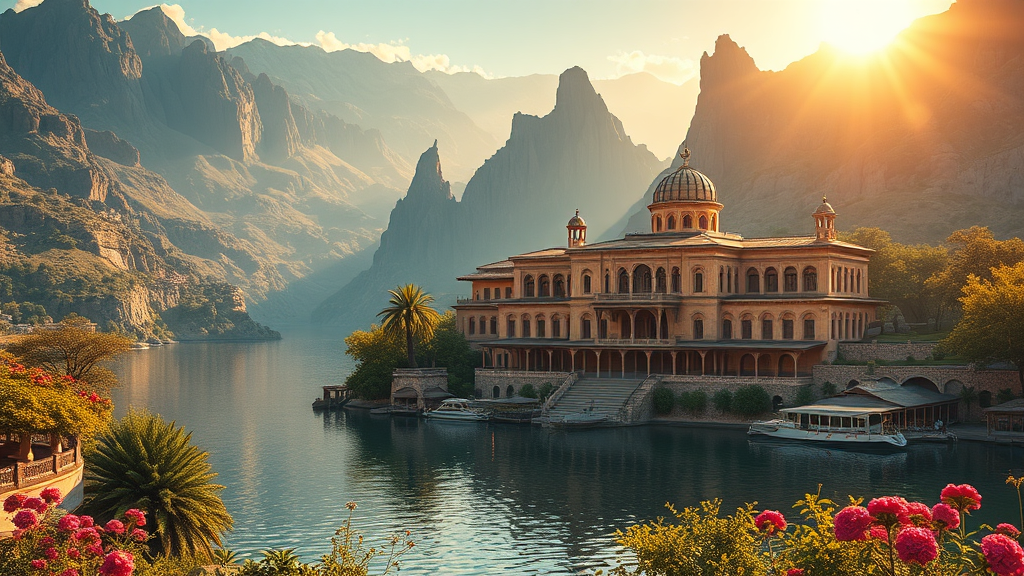dreamlikeart, an expansive Persian Villa gracefully nestled amidst water and lush nature, quaint village, intimate perspective, volumetric lighting, hyper-realistic, intricately detailed, Fantasy, epic cinematic capture, trending on ArtStation, majestic mountains, enchanting, mystical ambiance, matte painting, bright sunlit atmosphere, vibrant flowers, towering cliffs, Sweeper3D, UHD, HDR, 16K, seamlessly captured, without imperfections or artifacts.