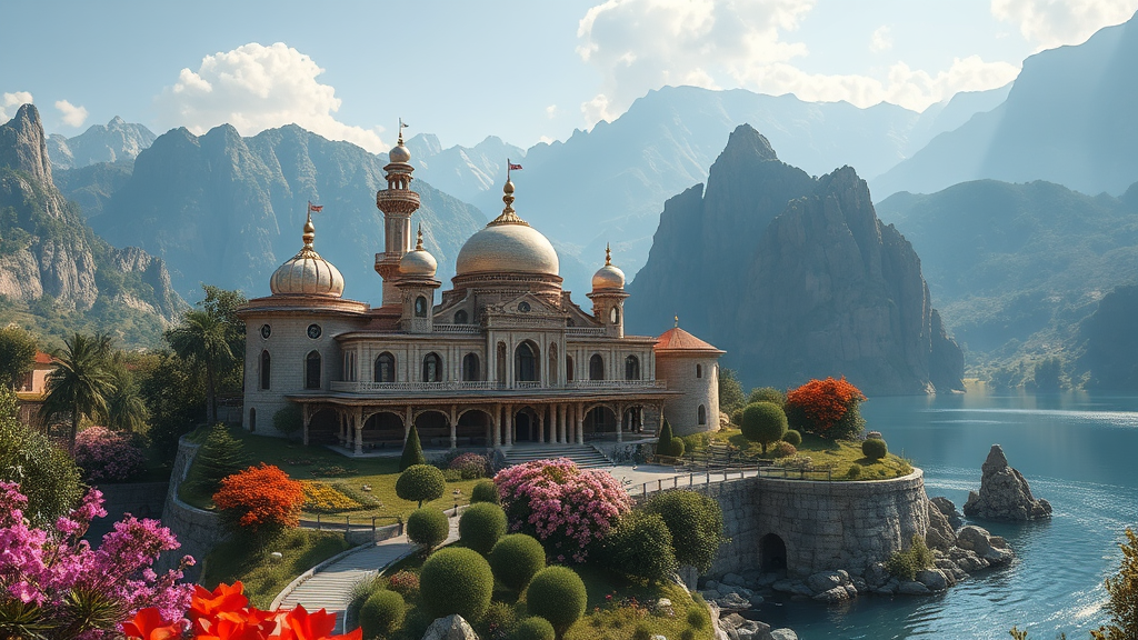Dreamlikeart big Persian Villa surrounded by shimmering water and lush nature set within a charming village close view with ethereal volumetric lighting featuring photorealistic elements and intricate detailing in Fantasy style evoking an epic cinematic shot trending on ArtStation with majestic mountains adding a magical mystical touch captured in matte painting on a bright sunny day adorned with vibrant flowers and massive cliffs rendered using Sweeper3D in ultra-high-definition HDR 16K quality.