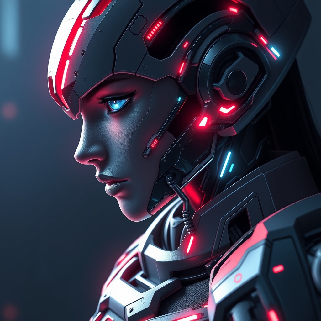 dreamlikeart, digital art, digital painting, anime, portrait of advanced military cyborg, cyberpunk, warframe style, stealthy, heavily armored, glowing neon accents, character design, intricate surfaces, smooth and detailed facial features, highly detailed and symmetrical, volumetric and ambient lighting, real-time vfx, digital 3d, uhd hdr 3d quality, dynamic side profile, ethereal atmosphere, edge of frame composition, exploring beauty beyond conventional, unique anatomy and artistic proportions, bold and imaginative interpretation, visionary concept, elegant elongation, striking cropped composition.