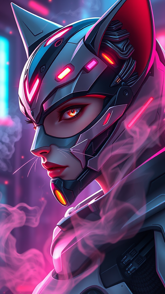 dreamlikeart, digital painting, anime-inspired portrait of a futuristic military cyborg in a cyberpunk setting, featuring a feline design. The warrior showcases stealth and armor reminiscent of a warframe, surrounded by vibrant neon lights and swirling smoke. The character design highlights hard surfaces yet smooth transitions with intricate, symmetrical, and highly detailed features. Volumetric and ambient lighting enhance the face, captured in a real-time setting with VFX elements. The visual is UHD with HDR 3D qualities, focusing on a side profile. The character's mouth and ears are partially visible, contributing to an enigmatic allure, yet there's a sense of elongated proportions and cropped features creating an intentionally surreal, dreamlike effect.